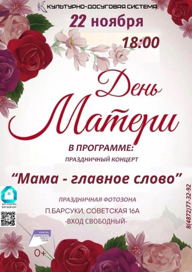в Доме Культуры “БАРСУКОВСКИЙ” с нетерпением ожидается праздничный концерт, посвящённый Дню Матери, который станет настоящим торжеством любви, заботы и благодарности Наполненный яркими выступлениями, этот вечер обещает стать незабываемым для всех