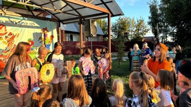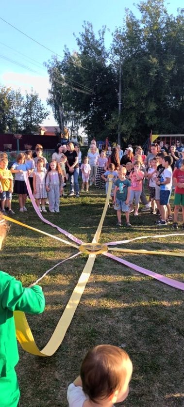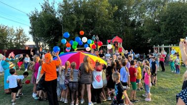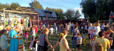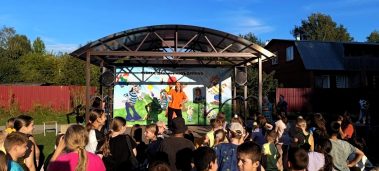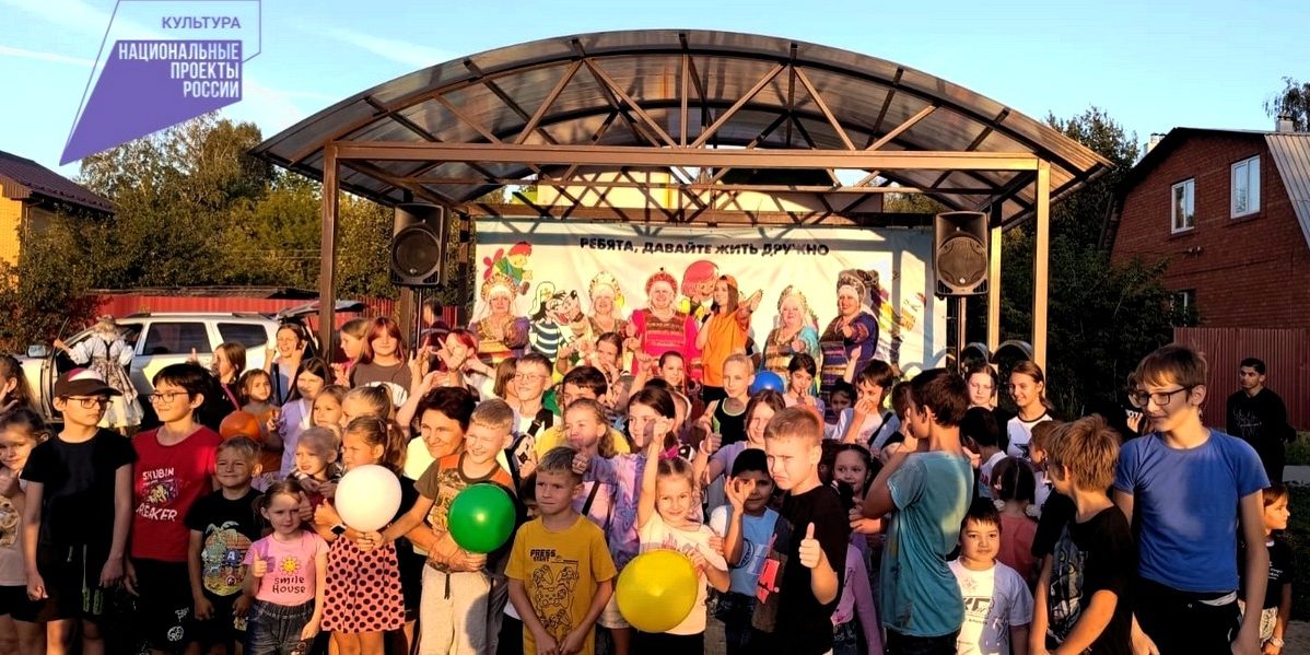Юные жители поселка сделали веселую зарядку, собрали портфель, провели весёлые уроки, танцевали, пели и соревновались в ловкости.