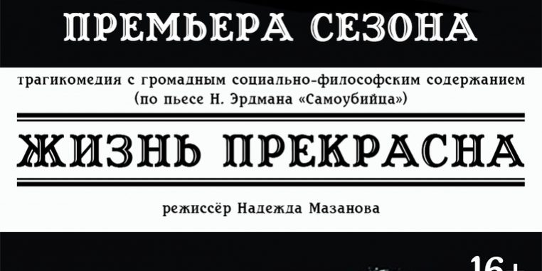 Друзья! Мы рады объявить о премьере сезона! 19 ноября на сцене театра “Эрмитаж” – “Жизнь прекрасна”, трагикомедия с громадным социально-философским содержанием по пьесе Николая Эрдмана “Самоубийца”.