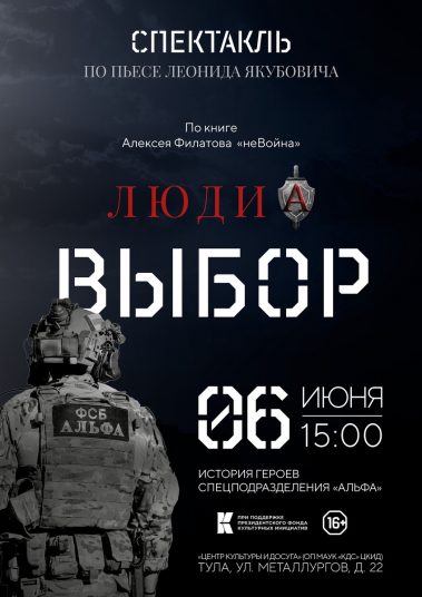 06 июня (четверг) 2024 в 15:00 в “Центре культуры и досуга» (г. Тула, ул. Металлургов, д. 22) состоится премьера спектакля “Люди А. Выбор” по пьесе Леонида Якубовича, написанной по мотивам документального романа Алексея Филатова “неВойна”.