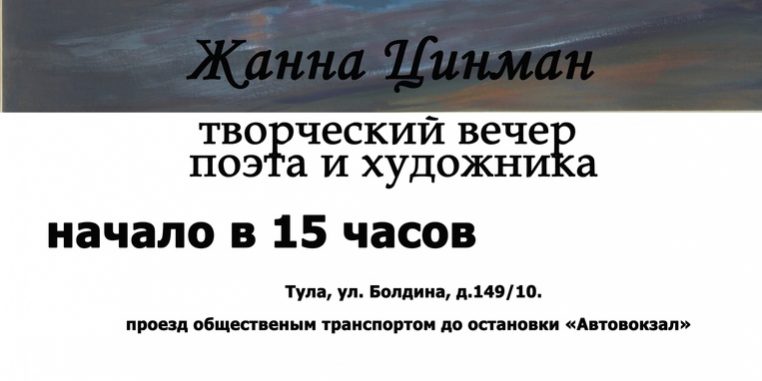 24 марта 2019 года в 15.00 в читальном зале Центральной городской библиотеки им. Л.Н. Толстого МУК «Тульская библиотечная система» (ул. Болдина д.149/10) состоится творческий вечер поэта и художника Жанны Цинман «Tiamo».