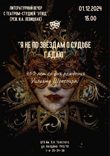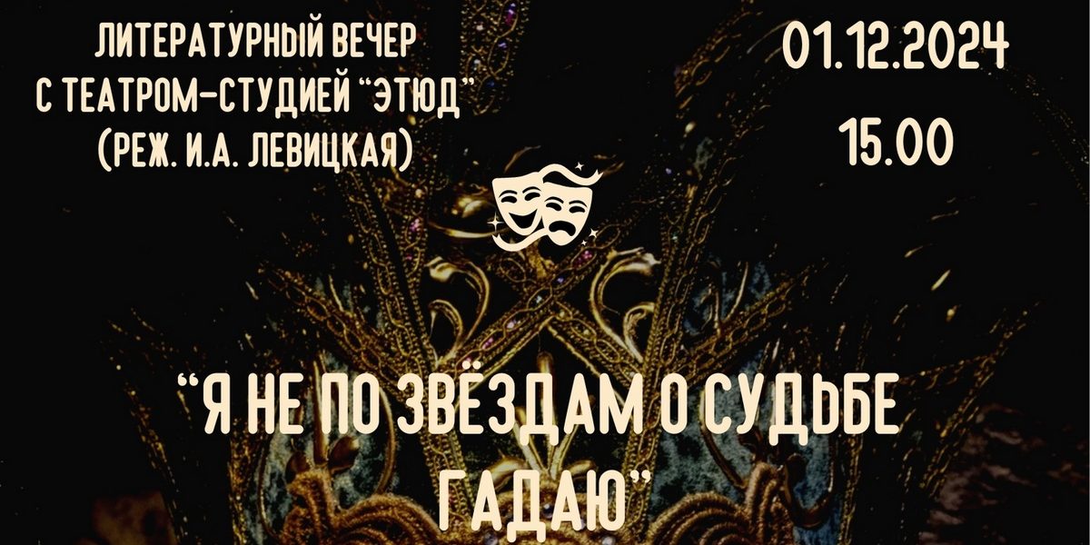 Приглашаем вас на литературный вечер “Я не по звездам о судьбе гадаю” в содружестве с театром-студией “Этюд” (реж. И.А. Левицкая), который состоится 1 декабря в 15.00 в читальном зале библиотеки.