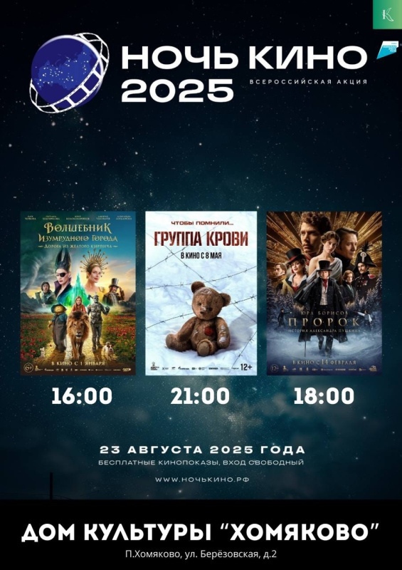 23 августа в Доме культуры “Хомяково” состоится Всероссийская акция “Ночь кино”.