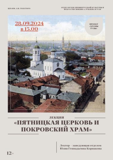 В Центральной городской библиотеке имени Л.Н. Толстого продолжает свою работу проект “Храмы Тулы”, организованный отделом Музея древнерусской культуры и искусства имени А. Рублева. Тема очередной лекции – “Пятницкая церковь и Покровский храм”.