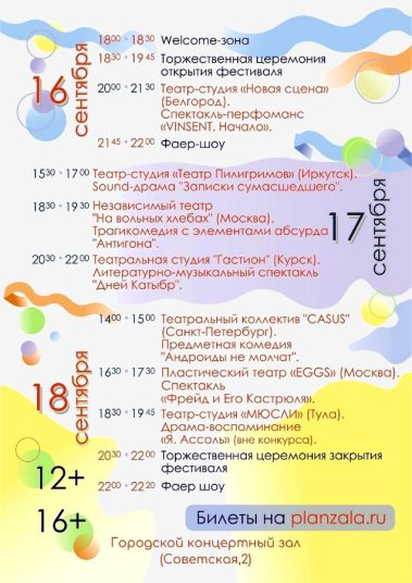С этого года мы сотрудничаем с сервисом planzala.ru. При единовременной покупке билетов на любое количество фестивальных спектаклей больше одного (от двух до семи, то есть:)) вы получаете приятную скидку в 10%. Можно уже отправляться на сайт за театральными впечатлениями! В этом посте мы публикуем ссылки на все спектакли – а в ближайшие дни расскажем здесь о каждом более подробно!