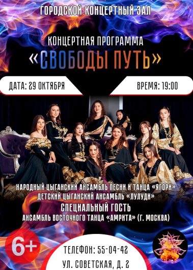 Для всех, кого манит путь свободы, кому хочется вдохнуть свежего воздуха, полюбоваться яркими красками и махнуть вдаль “за цыганской звездой кочевой”, – программа “Свободы путь” цыганского ансамбля “Ягори” (руководитель Екатерина Абальмаз)