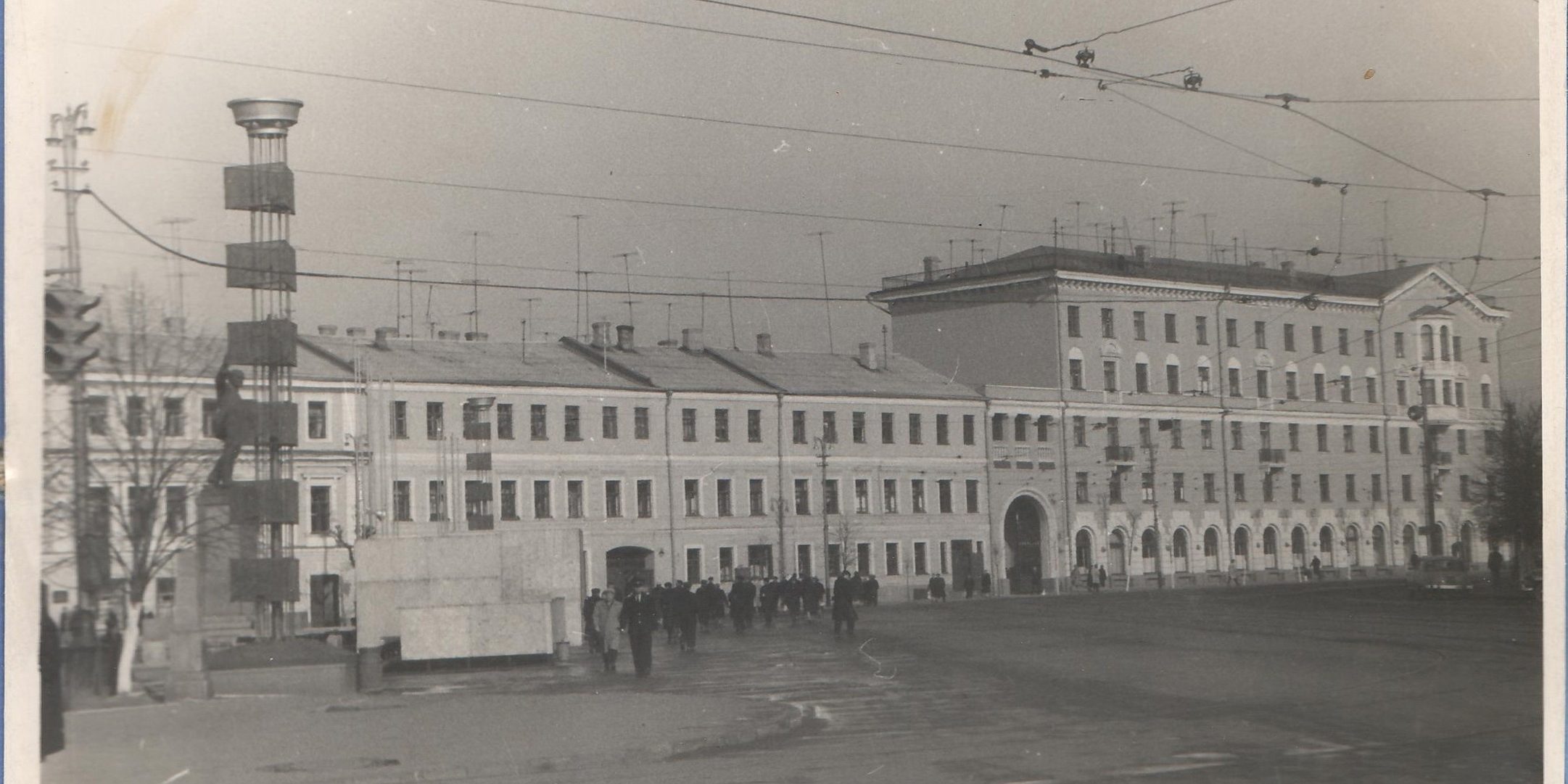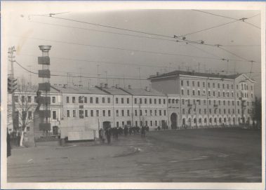 Какое-то время возле памятника на площади Восстания находился сквер, однако в 1930-х ее полностью заасфальтировали. Фото сделано весной, в процессе подготовки к празднованию 1 Мая. Возле фигуры Ленина виден фанерный остов трибуны, мимо которой в день праздника пойдут колонны демонстрантов. На заднем плане, за памятником – дома дореволюционной постройки, в советское время надстроенные третьим этажом. Правый из них (ул. Советская, 50, ныне – ул. Советская, 12) примечателен тем, что еще с 1920-х здесь находился губернский отдел труда, помогавший рабочим с поиском вакансий и защищавший их от нарушений трудового законодательства. Его преемница, городская служба по трудоустройству, под разными названиями находилась по этому же адресу вплоть до конца 1990-х. С правой стороны площадь оканчивается помпезным домом сталинской эпохи, типичным для 1950-х гг”.