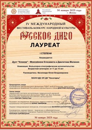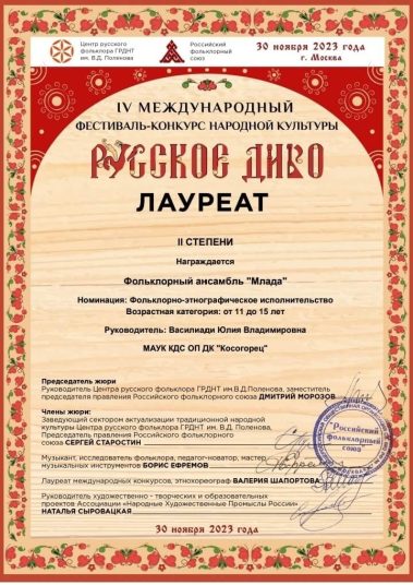 Дуэт “КЛЮКВА” солистки фольклорного ансамбля “МЛАДА” Давлетова Мелания и Моисейкина Елизавета Лаурет I Степени, поздравляем девчонок с дебютом! Фольклорный ансамбль “МЛАДА” старший состав ЛАУРЕАТ II СТЕПЕНИ! Девчонки, с победой! Народный фольклорный ансамбль “СМОРОДИНА” ЛАУРЕАТ I СТЕПЕНИ!