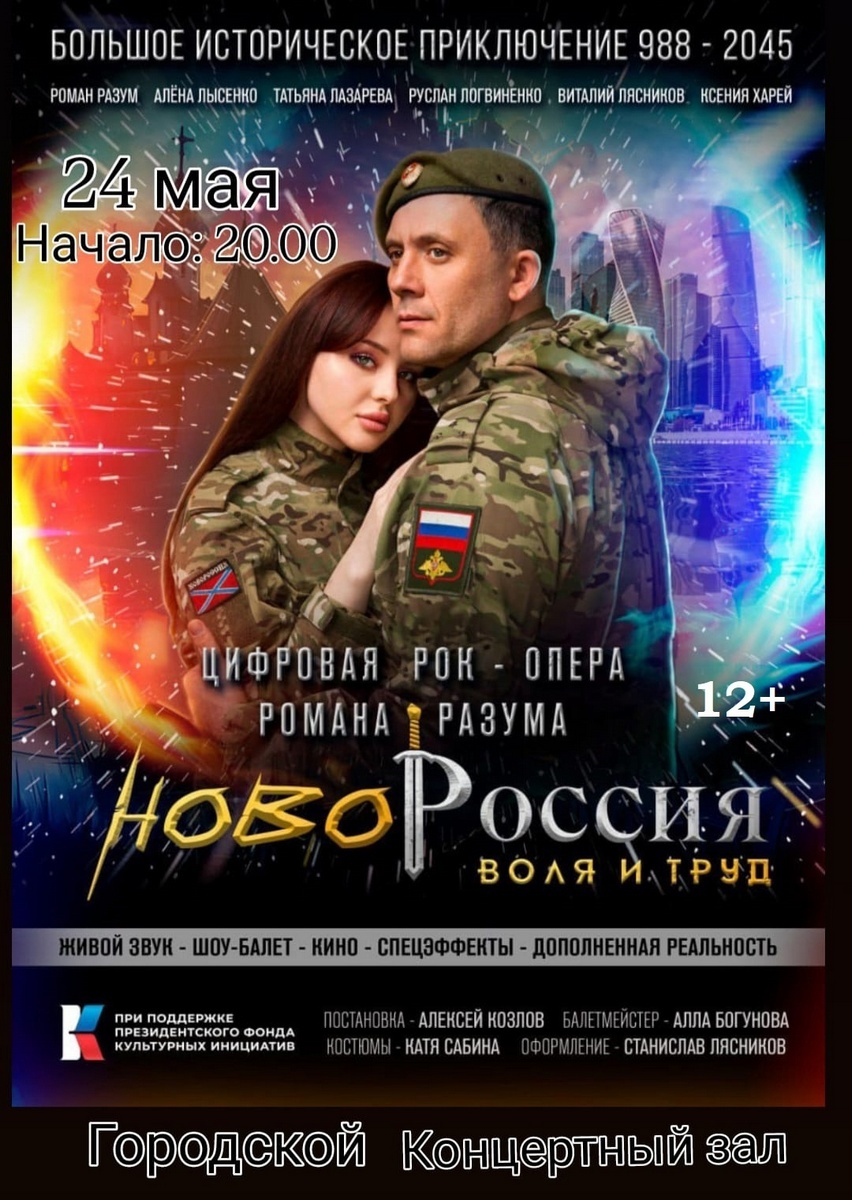 17 мая в Центральном театре Российской армии состоялась премьера цифровой рок-оперы заслуженного артиста ЛНР Романа Разума “Новороссия – Воля и Труд”. Мероприятия проходит при поддержке Президентского фонда культурных инициатив. Постановка создана в Луганске.