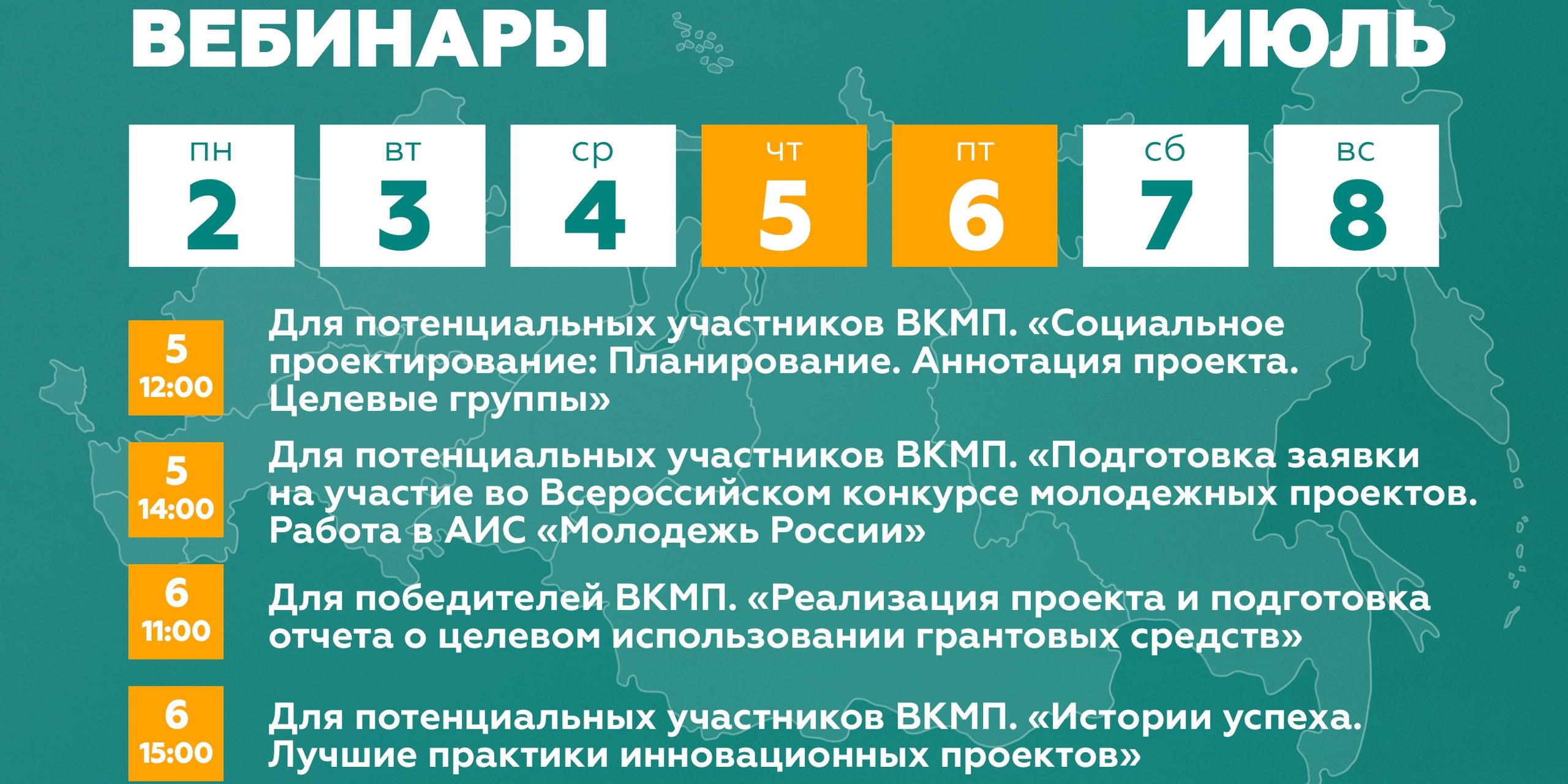 С 5 по 6 июля состоится очередная серия вебинаров. Эксперты проведут онлайн-встречи с участниками из различных регионов нашей страны для обсуждения правил, алгоритмов и особенностей оформления проектов для прохождения конкурсного отбора. В свою очередь, победители ВКМП получат рекомендации об успешной реализации проекта и подготовки отчета о целевом использовании грантовых средств.