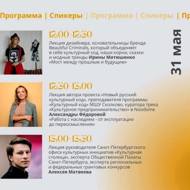 • Выступления именитых спикеров, в том числе Ирины Матюшенко, Александры Федоровой, Алексея Матвеева и других