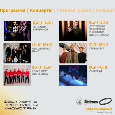 • Насыщенная музыкальная программа с выступлениями групп GINGER BRASS BAND, CRAZY ARMY DRUM SHOW и хедлайнеров – группы Перемотка