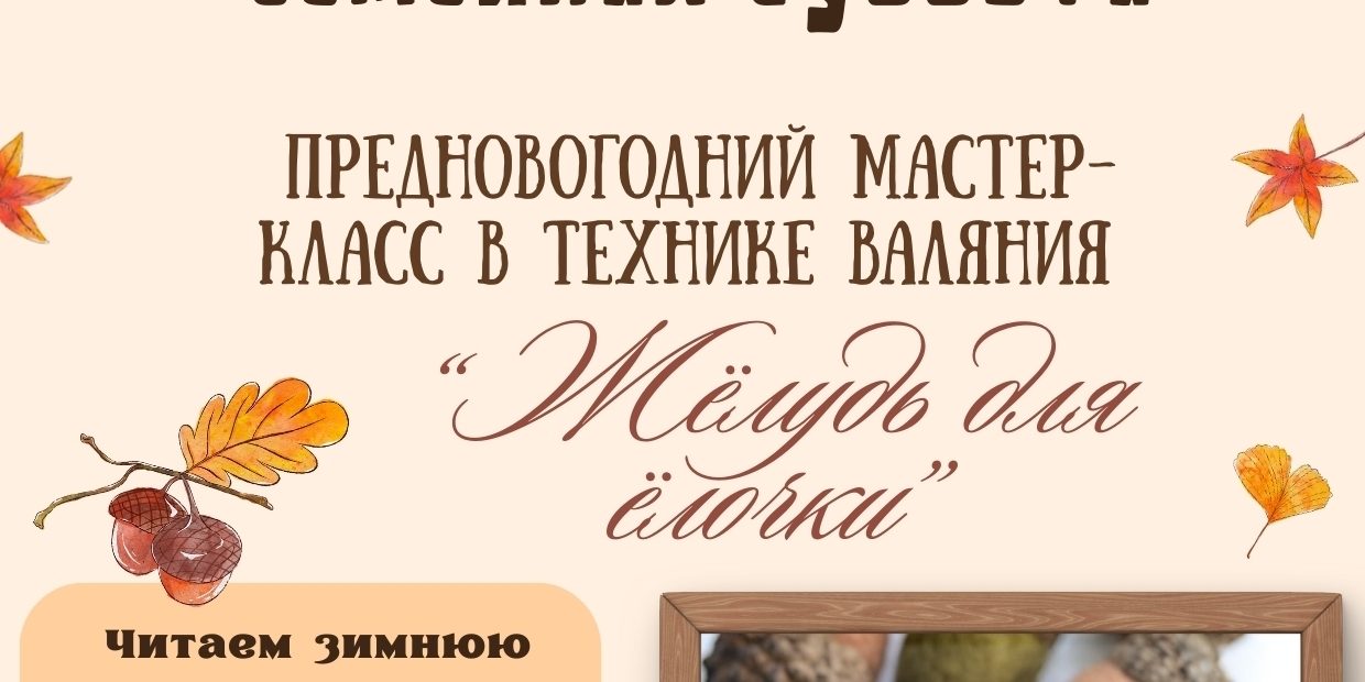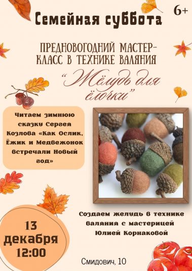 Предновогодний мастер-класс от тульской мастерицы Юлии Корнаковой. Освоим уютную технику валяния и создадим своими руками милую ёлочную игрушку — пушистый жёлудь, который станет первым украшением вашего праздничного дома.