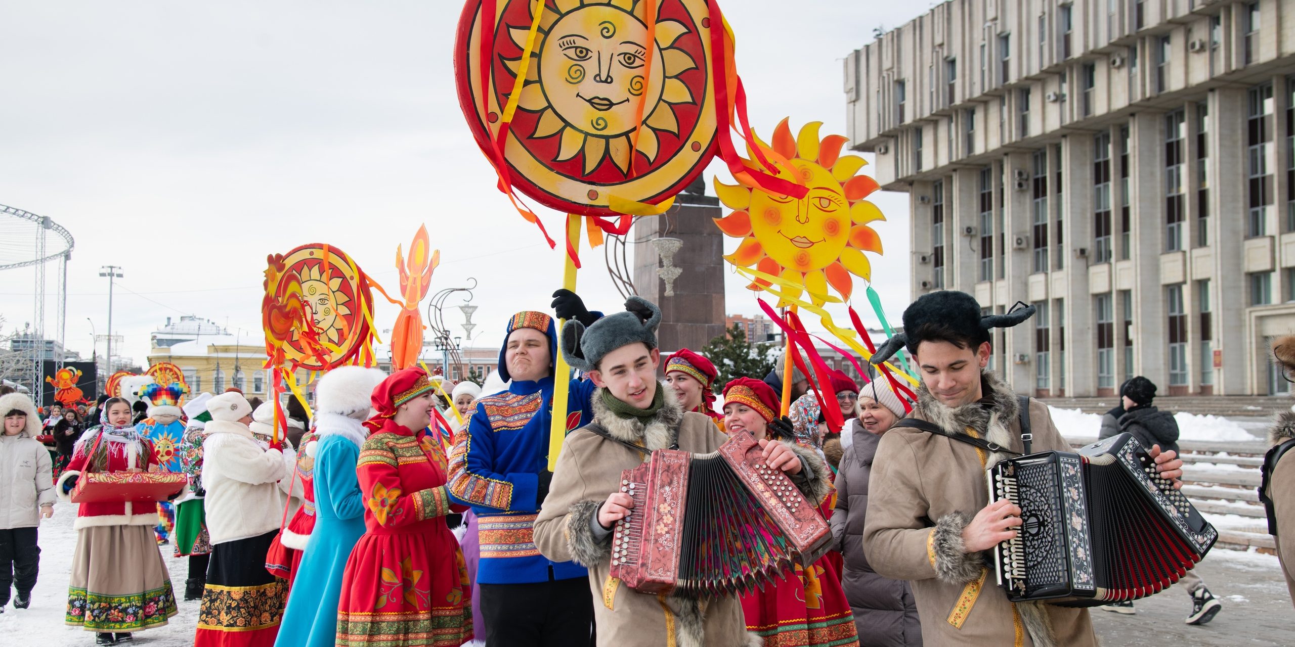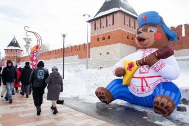 Особую атмосферу создали впечатляющие декорации с ярко выраженным тульским колоритом: объёмный расписной реквизит, нарядные лапти, масленичные надувные фигуры и яркие ростовые куклы!