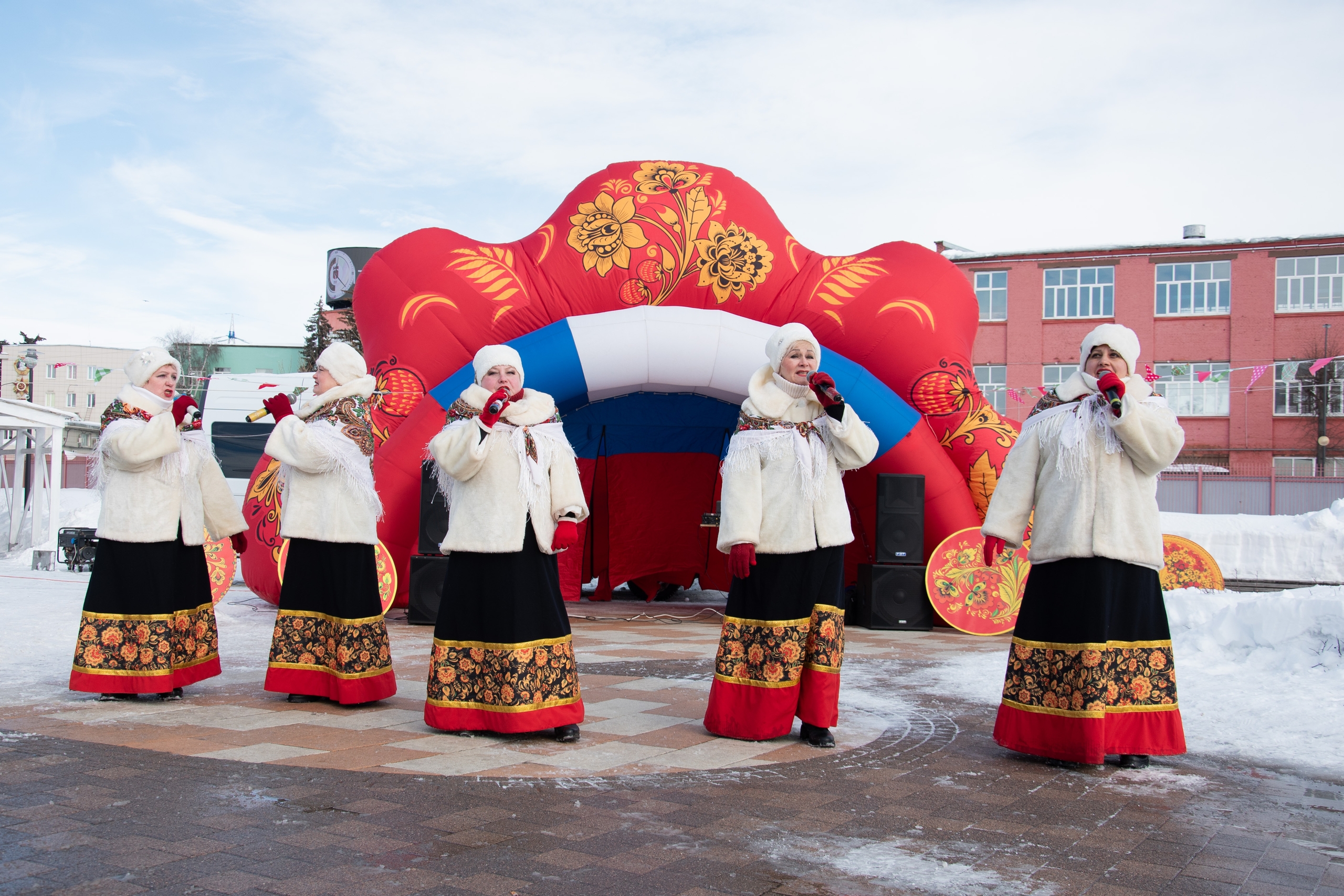 Особую атмосферу создали впечатляющие декорации с ярко выраженным тульским колоритом: объёмный расписной реквизит, нарядные лапти, масленичные надувные фигуры и яркие ростовые куклы!