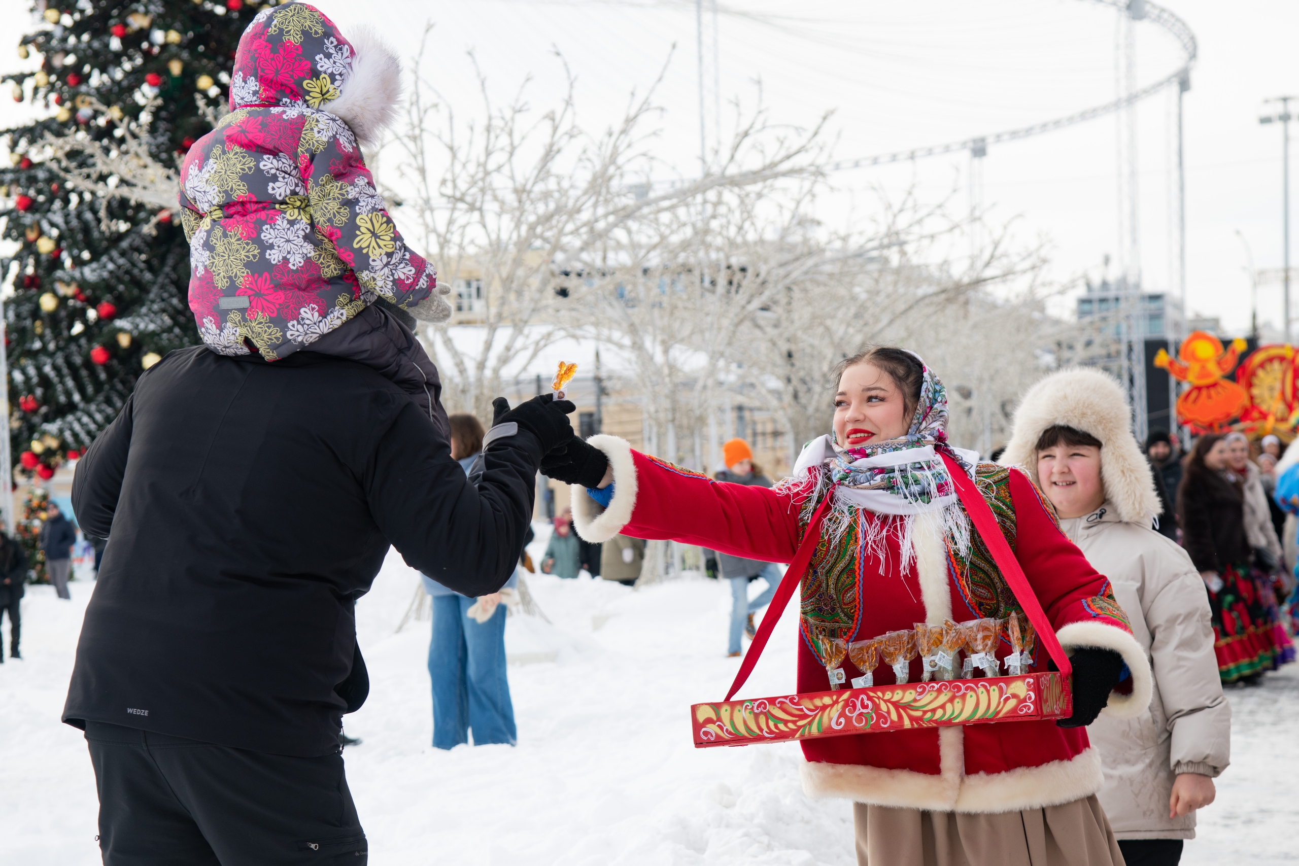 На протяжении всего народного гуляния, вдоль набережной раскинулись развлекательные площадки с профессиональными аниматорами. Дети и взрослые смогли поучаствовать в мастер‑классе “Масленичная кукла”, а также получить сладкие угощения от праздничных коробейников.