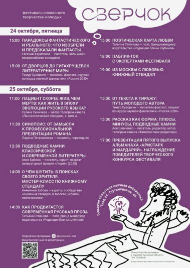 24 и 25 октября в Тульской областной научной библиотеке пройдут главные дни фестиваля словесного творчества “Сверчок”.