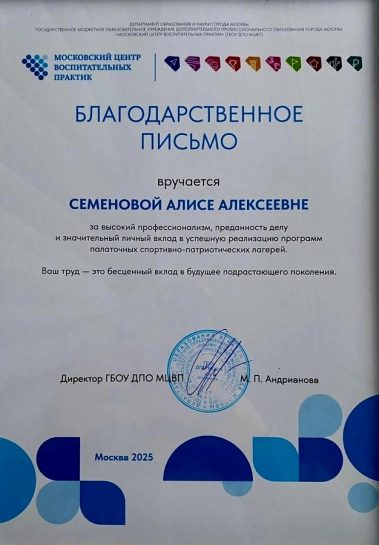 20 ноября в московском Музее Победы состоялась торжественная церемония награждения, в ходе которой Министерство образования и науки города Москвы вручило благодарственное письмо хореографу детского-музыкального театра “Канарейкин дом” и вокально-хоровой студии “Звонкие_капельки” – Алисе Алексеевне Семеновой.