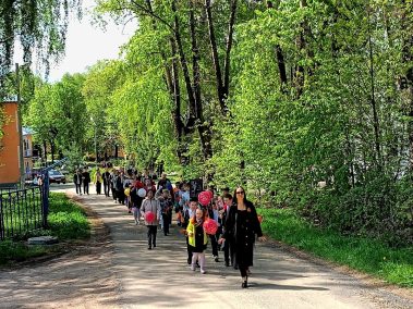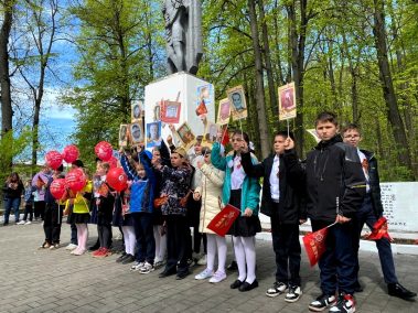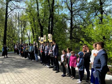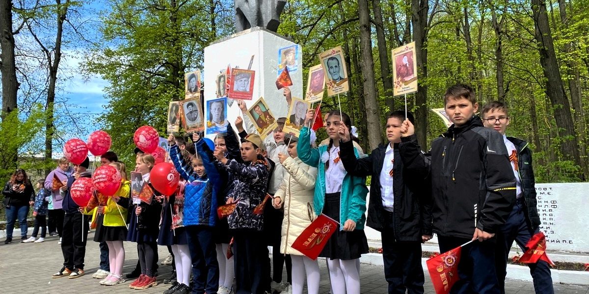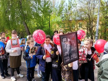 В колонну, которая собралась на площади около ДК, встали учащиеся и учителя из ЦО №13 им. Е. Н. Волкова, средней школы им. А. М. Гаранина, местные жители, труженики тыла, “дети” войны. Многие шли с портретами своих родственников – героев Великой Отечественной войны.