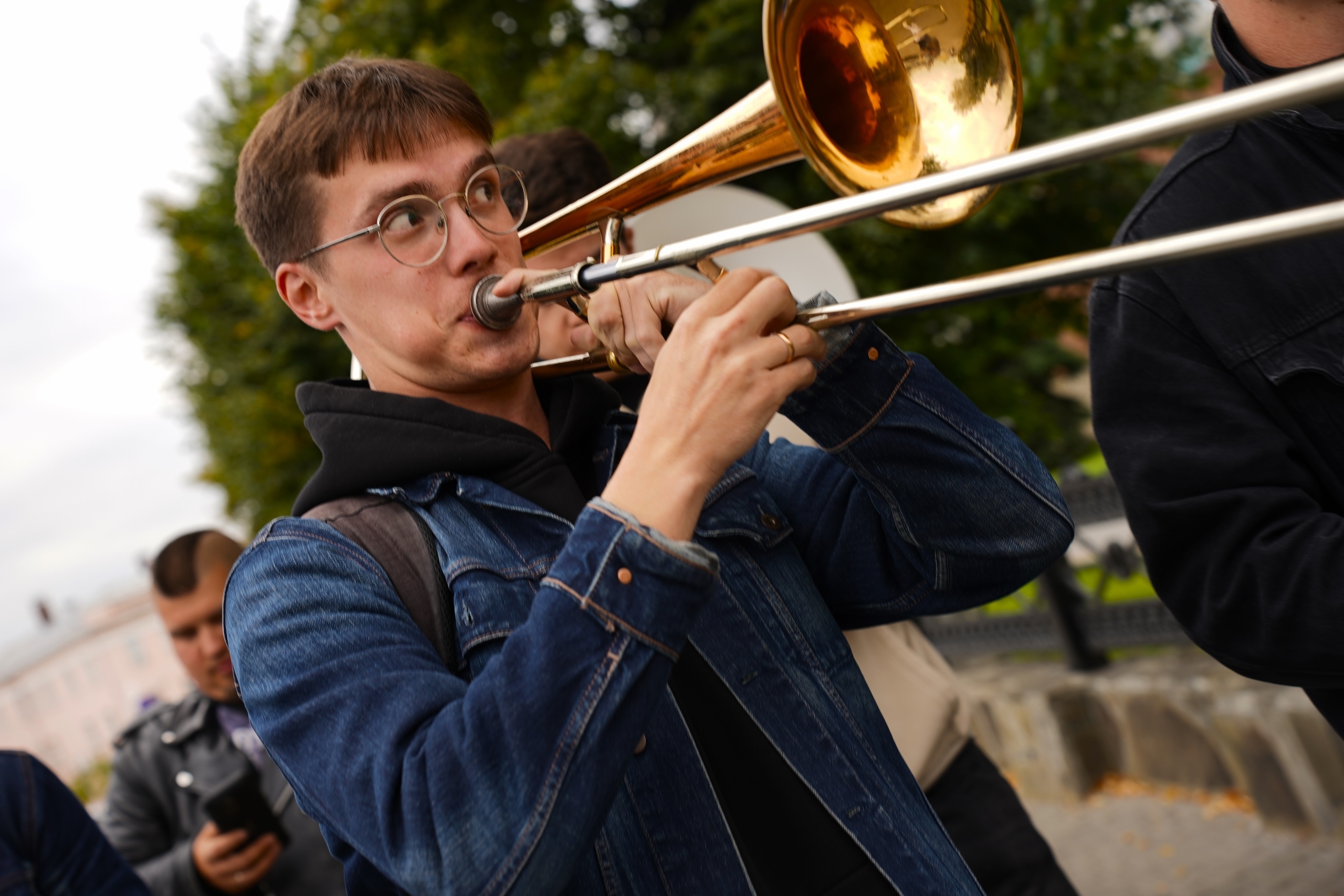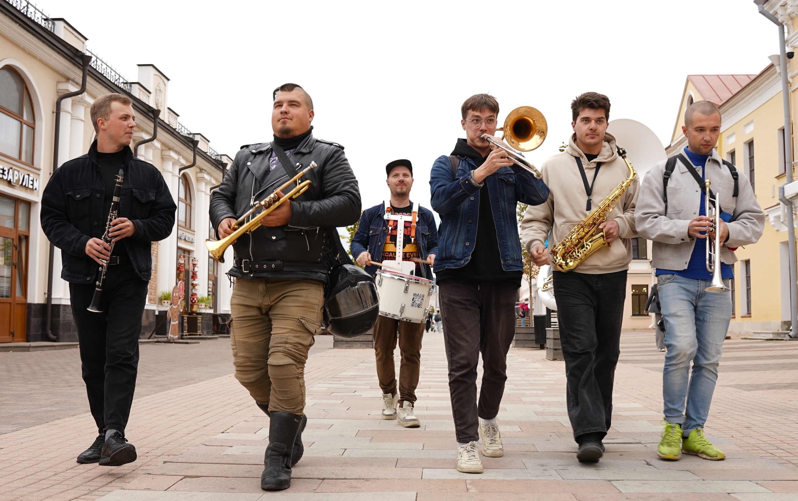 На днях GINGER BRASS BAND снова прошёлся по улицам Тулы и подарил много ярких эмоций прохожим. Ещё бы: идёшь себе, скучаешь, и тут такие шумные, бравые парни навстречу! Повезло счастливчикам, оказавшимся в нужное время в нужном месте.
