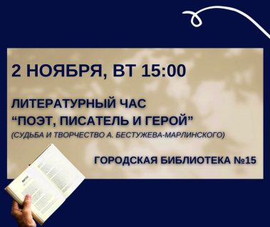 На этой неделе тебя ждут мероприятия ко Дню народного единства, игротека, мастер-класс по изготовлению закладок, знакомство с творчеством Александра Бестужева, известного в литературе под псевдонимом Марлинский.