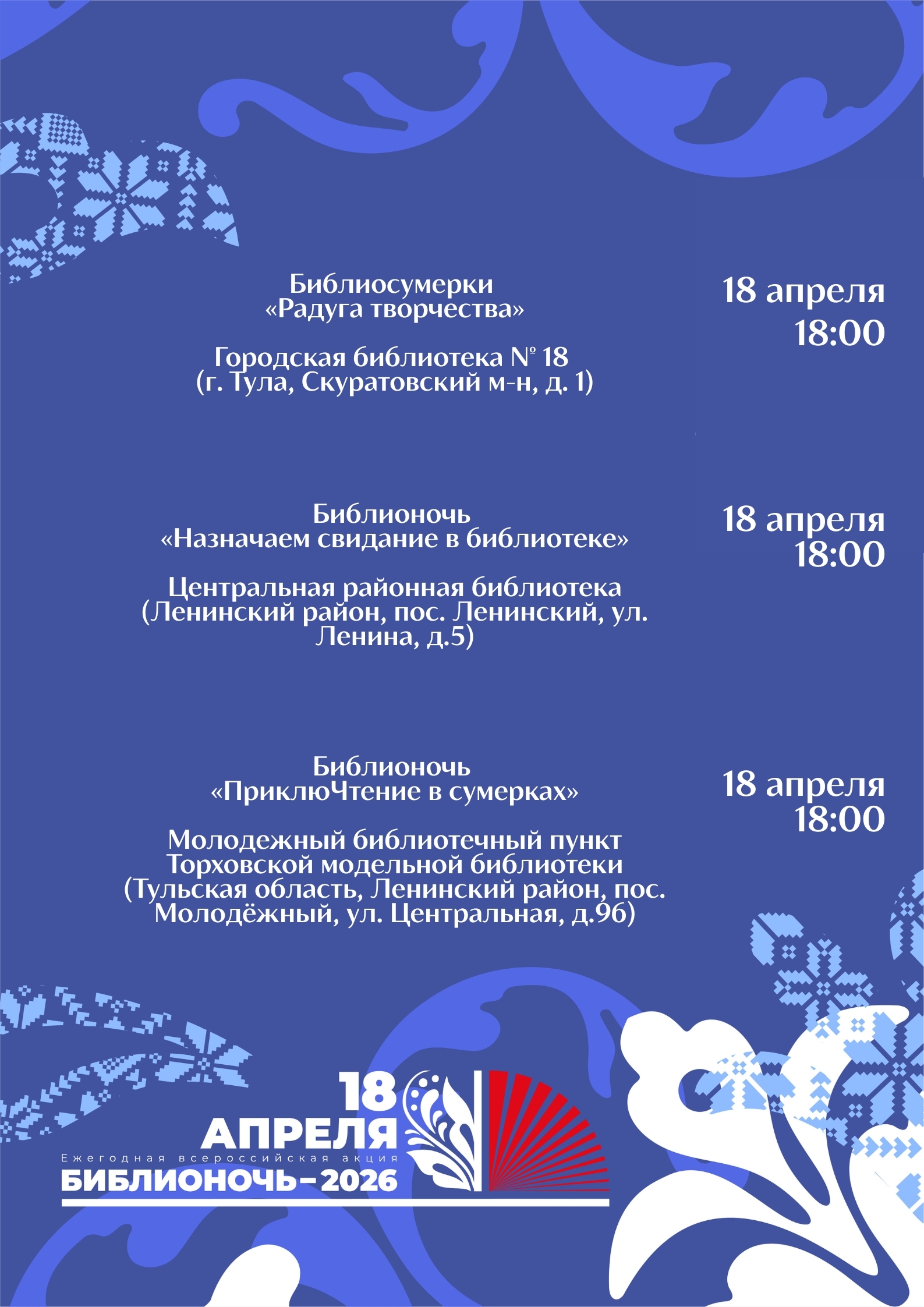 “Библионочь” – это шанс вырваться из будничной рутины, открыть для себя новые книги и жанры, а также провести вечер в тёплой, творческой атмосфере. Вас ждут сюрпризы, встречи с интересными людьми и море вдохновения.
