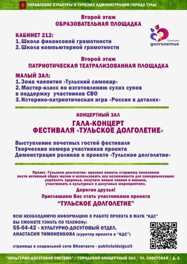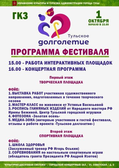 В городе Тула на базе “Культурно -досуговой системы” организован региональный проект “Тульское долголетие”. Программа направлена на организацию досуга и образования пожилых людей в возрасте от 55 лет и старше.