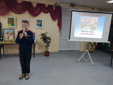 Андрей Нересов, самый юный член клуба, прочитал А.Т.Твардовского “Рассказ танкиста” и исполнил на дудочке “Грустная песенка” П.И.Чайковского.