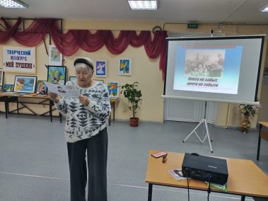 Ситников Александр Павлович прочел стихотворение “Кажется, не кончилась Война” из своего сборника “Не снижая высоты”. Он рассказал историю о встрече с женой героя Советского Союза Леонида Рыкова, Марией. Затем прочитал стихотворение «Леонид и Мария», которое посвятил этой героической паре.