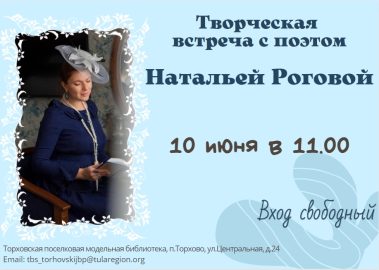 10 июня в 11.00э в Торховской поселковой модельной библиотеке состоится творческая встреча с тульским поэтом Натальей Роговой.