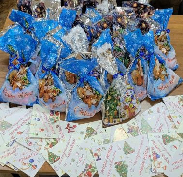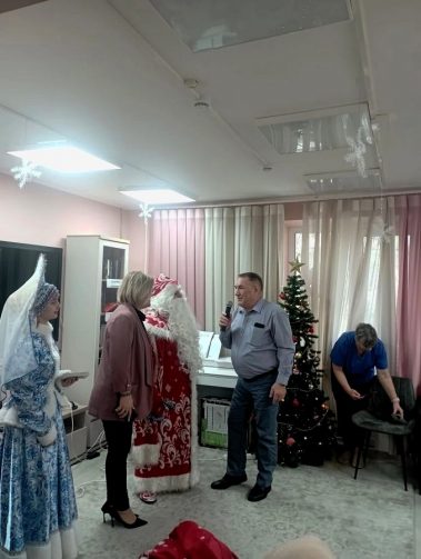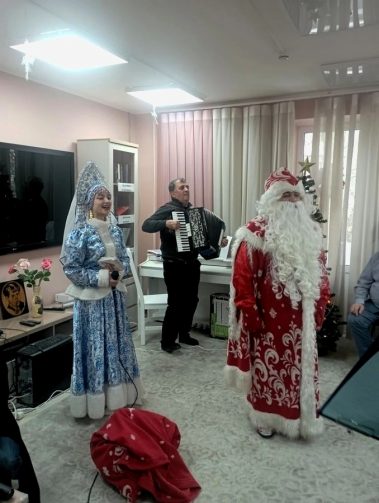 Дед Мороз и Снегурочка подарили всем сладкие новогодние подарки от ИП Поляков и открытки от участников творческой студии “Акварель” руководитель Ерасова Елена Евгеньевна.