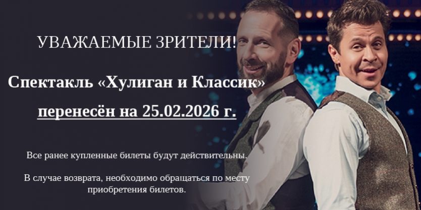 Уважаемые зрители! Сообщаем вам, что спектакль “ХУЛИГАН И КЛАССИК” перенесён на 25 февраля в 19:00 в ГКЗ. Все ранее купленные билеты будут действительны.