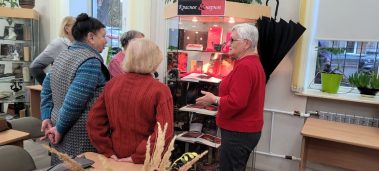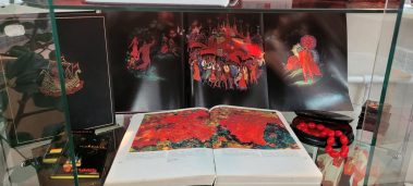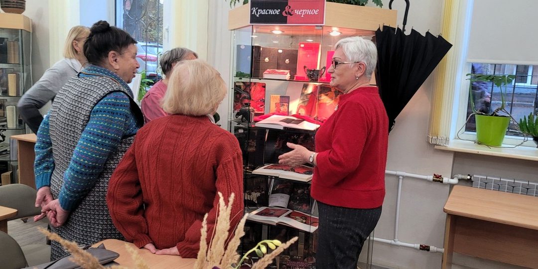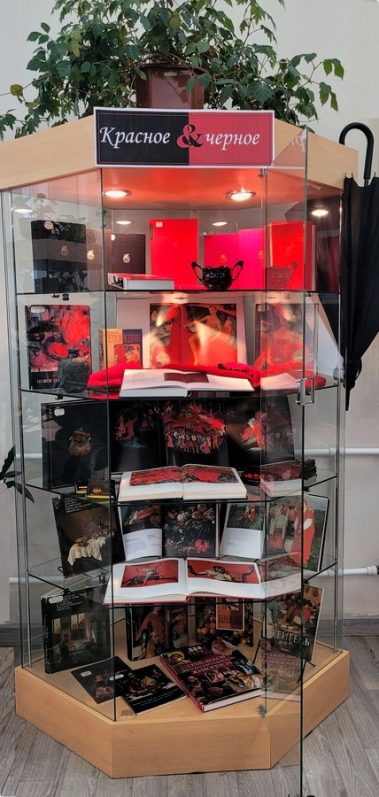 На выставке представлены книги по искусству с XV по XX века. И конечно репродукция картины “Черный квадрат” Казимира Малевича – “главного фокуса в балаганчике самоновейшей культуры” – так писал А. Бенуа. Драпировка из ткани, зонтик, вазы, шкатулки, украшения. Буйное сочетание цветовых пятен сложилось в единую гармонию – красное и черное. Каждый элемент на выставке проникнут естественной энергией света, несущей радость, надежду и добро.