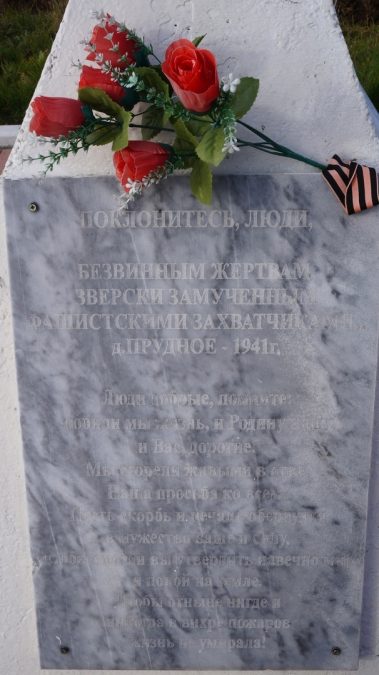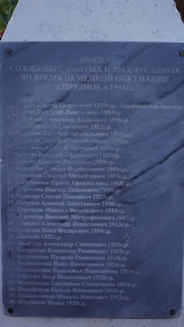 Немцы, приехав в д. Прудное, отдали приказ о сборе всего населения. Женщин с детьми построили в одном месте, мужчин – в другом. Разделив мужчин на молодых и престарелых, приказали молодых отправить в глубокий тыл к немцам, а стариков в количестве 20 чел. заперли в сарай и зажгли. Все 20 чел. сгорели в сарае на глазах жителей д. Прудное.