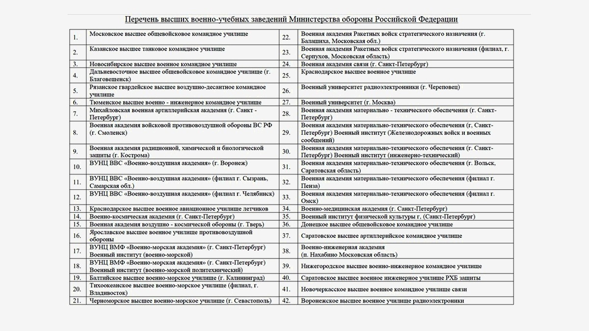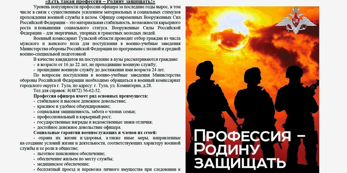 В рамках военно-профессиональной ориентации молодёжи города Тулы военный комиссариат городского округа г. Тулы проводит отбор кандидатов из числа граждан мужского и женского пола для поступления в военно-учебные заведения Министерства обороны Российской Федерации по программам с полной и средней военно-специальной подготовкой.