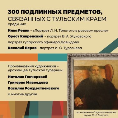 Впервые регион примет 300 подлинных предметов от 12 ведущих федеральных музеев России. Сюжеты полотен будут тесно связаны с тульской землей: портреты знаменитых туляков, самовары, оружие, традиционная одежда и тульская природа.