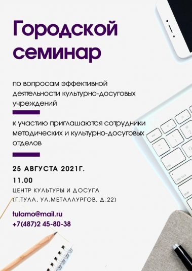 В преддверии нового творческого сезона 2021-2022 годов Городское методическое объединение культурно-досуговых учреждений г. Тулы проводит городской семинар для сотрудников методических и досуговых отделов по вопросам эффективной деятельности культурно-досуговых учреждений.