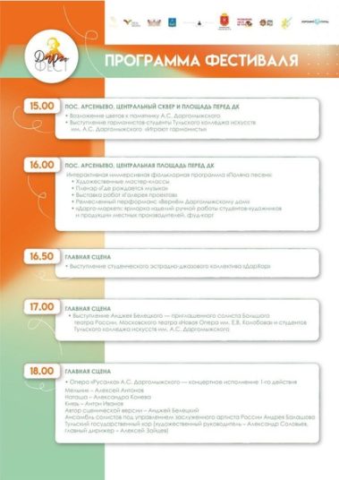 • Главным событием фестиваля станет концертное исполнение оперы “Русалка” в постановке Анджея Белецкого, с участием солистов оперных театров Москвы и творческих коллективов Тульской области.