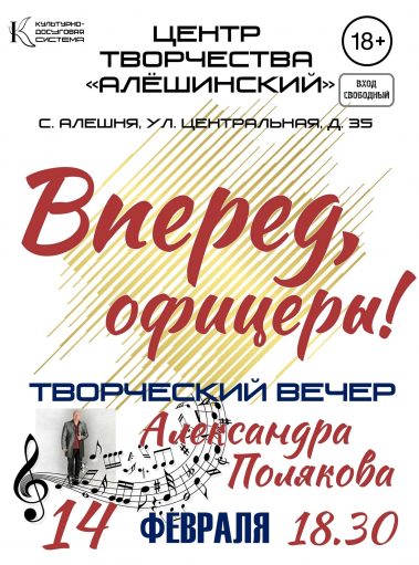 14 февраля приглашаем всех желающих в Центр творчества “АЛЁШИНСКИЙ” на творческий вечер замечательного вокалиста – Александра Полякова. Вечер, пронизанный патриотизмом, безграничной любовью к нашей великой стране, мужеством и отвагой, музыкой и песнями.