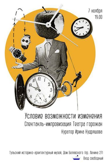 “Условие возможности изменения” – именно так словари формулируют одно из определений понятия «времени». Быстротечное, тянущееся, убитое, золотое, – время стало предметом исследования этого курса театра. Не опаздывайте! Время не ждет!”