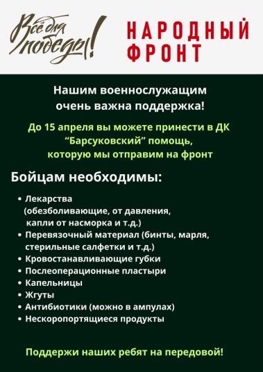 до 15 апреля в Дом культуры “Барсуковский” можно принести продукты и лекарства, которые будут отправлены на передовую.