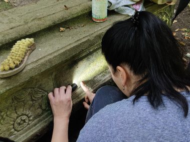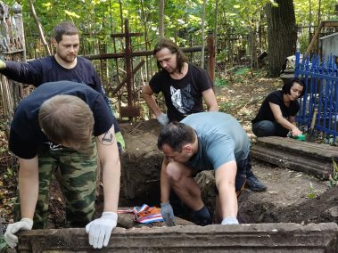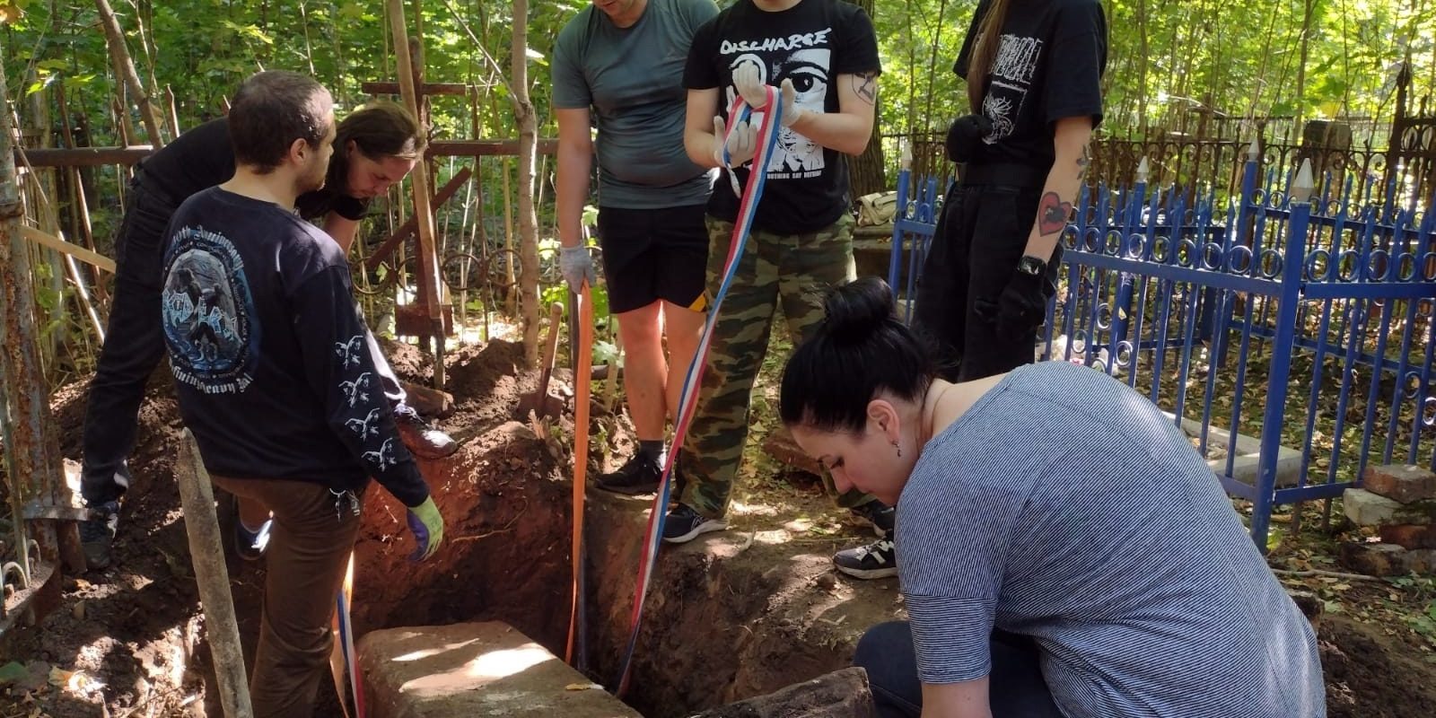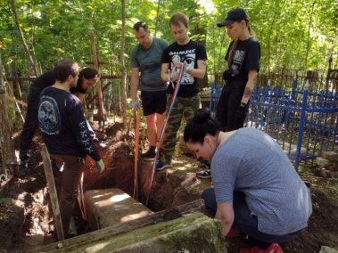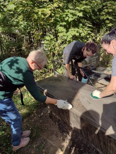 На сей раз волонтёры в течение всего субботника раскапывали и поднимали одну надгробную плиту. Её верхняя часть показалась ещё на прошлой неделе, сейчас же камень предстояло полностью освободить от земли и установить на поверхности. Однако ограниченное пространство и внушительные размеры плиты значительно усложняли эту задачу.