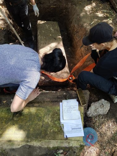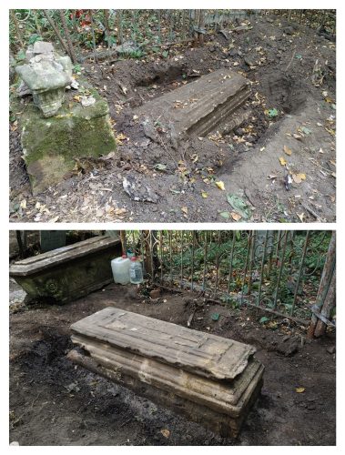 Время шло, силы кончались, а камень оставалась в яме. Но волонтёры Всехсвятского кладбища не бросают дело на полпути. Постепенно с помощью законов физики, силы мышц и упорства плиту удалось приподнять и установить. После чего на неё вернулась верхняя съемная часть, а сам саркофаг был бережно отмыт. К сожалению, следов текста ни на одном из фасадов не было обнаружено. Зато изящный профилированный край плиты указывает на принадлежность надгробия к XVIII веку.