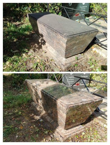 Зато очистка мраморного саркофага тульских купцов Черниковых оказалась быстрее и проще, нежели предполагалось. Краска на крышке надгробия, скрывавшая природный рисунок камня, постепенно смылась. И теперь розовый саркофаг блестит и переливается на солнце.
