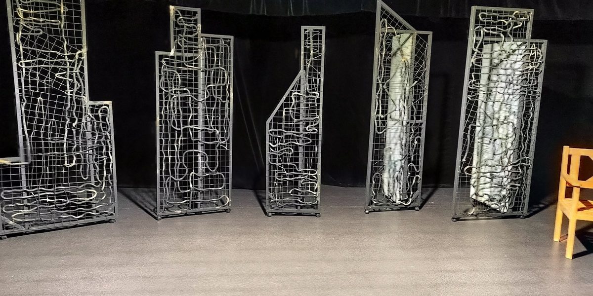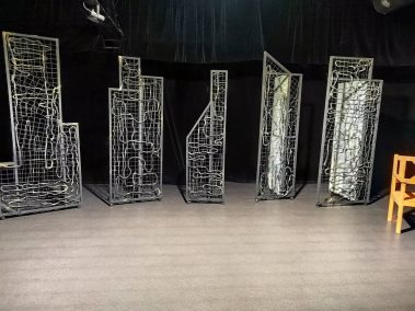 В основе оформления лежит идея “осознанной беспредметности”. То есть с одной стороны мы видим максимально условную декорацию, с другой — она символична и имеет несколько прямых ассоциативных значений (тюрьма, лабиринт коридоров).