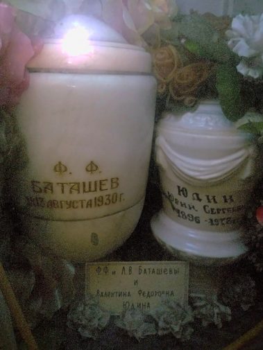 Супруги Черновы преподнесла в дар ТИАМу подарок, значение которого сложно переоценить: они передали нам фотографию ниши Донского колумбария в Москве. На изображении отчетливо видна урна, на которой написано «Ф.Ф. Баташёв. 13 августа 1930 г.» Рядом ещё одна урна с надписью “Юдин Юрий Сергеевич. 1896 – 1978” и памятная табличка с именами: “Ф.Ф. и Л.В. Баташёвы и Валентина Фёдоровна Юдина”. Эта фотография позволила установить точные даты и семейные связи. “Ф.Ф. Баташёв” — это безусловно, Фёдор Фёдорович Занфтлебен, который с 1915 года стал носить фамилию тестя – Баташёв, и который, как нам известно, родился в 1867 году. Теперь, благодаря полученной информации, мы можем утверждать, что последний период своей жизни он жил в Москве (вероятно, с целью затеряться в большом городе и не стать жертвой красного террора) и умер 13 августа 1930 года. Л.В. Баташёва – очевидно, его жена Лидия Васильевна; Валентина Фёдоровна Юдина – их дочь. И наконец, Юдин Юрий Сергеевич, – муж Валентины Фёдоровны и, соответственно, зять Занфтлебена.