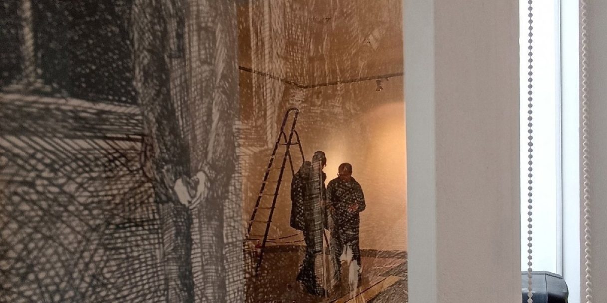 На фото Армена Аганесова: эпизод монтажа выставки “Внутри стен. Архитектура как контекст” в Доме Крафта.